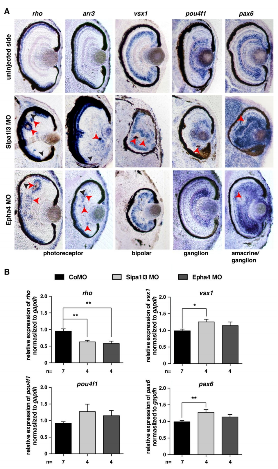 Sipa1l3 as well as Epha4 depletion results in disorganized retinal layers in the eye including rosette-like structures formed by displaced photoreceptor cells from the outer layer (black arrowheads) to the inner layers (red arrowheads) of the retina. Following marker genes were used to stain for retinal cell types at stage 42: arr3 and rho to determine photoreceptor cells; pax6 to detect amacrine and ganglion cells; vsx1 to visualize bipolar cells and pou4f1 to stain for ganglion cells. B qPCR experiments using cDNA of Sipa1l3 or Epha4 depleted stage 42 eyes revealed a down-regulation of rho, whereas the other analyzed marker genes were slightly up-regulated. CoMO injected embryos were used as control. Gapdh was used for normalization. n, number of independent experiments; ng, nanogram. Error bars indicate standard error of the means (s.e.m.); * pï£0.05; ** pï£0.01. P-values were calculated by a nonparametric, one-tailed Mann-Whitney rank sum test. |
