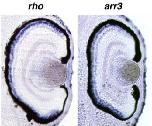The photoreceptor layer of the retina, adjacent to the black retinal pigmented epilthelium], is marked by arr3 (arrestin 3, retinal (X-arrestin)) and rho (rhodopsin) gene expression. |