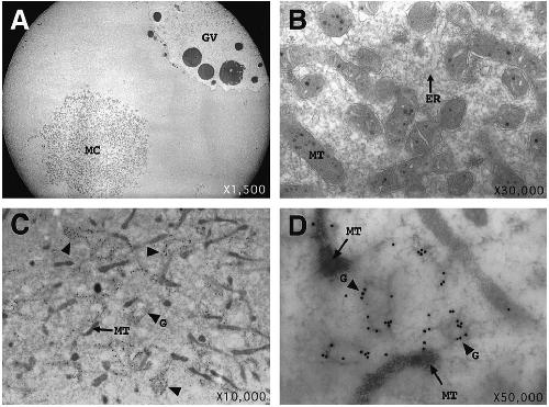 (MT), smooth endoplasmic reticulum (ER; arrow), and electron dense patches were observed. (C,D) Immunoelectron microscopy