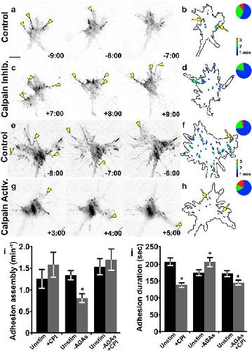 Calpain activity regulates adhesion dynamics in filopodia. a, c, Inverted contrast TIRF images of growth cones expressing paxillin-GFP displayed at 1 min intervals, over 10 min before (a) and after (c) the addition of CPI (calpain inhibition). b, d, Adhesion lifetime heat maps showing adhesion dynamics from the time points in a and c, respectively. The inset pie charts demonstrate the proportion adhesions with the lifetime 0â1 min (blue), 1â2 min (green), and 2â3 min (red). Note that the inhibition of calpain reduces the number of stable adhesions (arrows) and increases the number new adhesions (arrowheads). e, g, Inverted contrast TIRF images of growth cones expressing paxillin-GFP displayed at 1 min intervals (e) before and (g) after the removal of AGAs (calpain activation). f, h, Adhesion lifetime heat maps showing adhesion dynamics from the time points in e and g, respectively. Note that Ca2+-dependent activation of calpain reduces the formation of new adhesions (arrowheads) and stabilizes existing adhesions (arrows). i, j, Quantification of adhesion assembly (i) and duration (j) for calpain inhibition (+CPI), activation (âAGAs), or the combined removal of AGAs with the addition of CPI. Scale bar, 5 μm. n > 100 adhesions and n > 12 growth cones for each condition. *p < 0.05, MannâWhitney U test. |