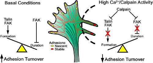 Ca2+/calpain regulation of adhesion dynamics and growth cone motility. Growth cones exhibit repulsive turning from local Ca2+ elevations in filopodia. Under basal conditions in our experiments, talin and FAK promote integrin-based adhesion formation, while FAK promotes the disassembly of adhesions to maintain consistent adhesion turnover. Local Ca2+ elevations (dashed lines) in response to repulsive axon guidance cues (presumed) or uncaging of Ca2+ in filopodia (this study) activates calpain. Filopodial calpain activity cleaves talin and FAK to prevent adhesion formation and turnover, and tips the balance between formation and duration that results in Ca2+-dependent repulsive turning. |