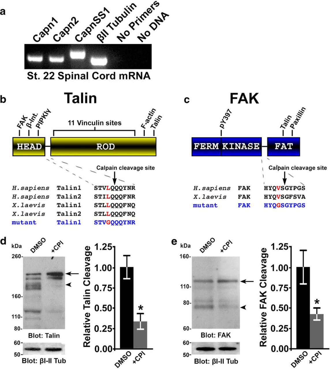 Talin and FAK are cleaved by calpain within the embryonic spinal cord. a, RT-PCR amplification of mRNA transcripts of calpain1 (262 bp), calpain2 (262 bp), calpainSS1 (299 bp), and βII tubulin (251 bp) from stage 22 Xenopus spinal cords. b, c, Schematic domain organization of talin (b) and FAK (c) showing approximate location of protein interaction motifs and calpain cleavage sites. Below are human and Xenopus protein sequences of the calpain cleavage sites, which are highly conserved between species. d, Immunoblots for talin from Xenopus neural tube lysates incubated in control media or media containing a calpain protease inhibitor (1 μm CPI) for 30 min. The full-length talin band is at 230 kDa (arrow), and the cleaved talin is at 190 kDa (arrowhead). An additional calpain-dependent fragment (Vinculin-Actin-Dimerization domain fragment) was found at 120 kDa (not quantified). Note that all bands appear as doublets since the antibody recognizes both talin isoforms. The average talin cleavage in control and CPI (right) was quantified from the large isoform band intensities (190 kDa band/230 kDa) from multiple blots (n = 7). e, Immunoblots for FAK from Xenopus neural tube lysates incubated in control media or media containing a calpain protease inhibitor (1 μm CPI) for 30 min. The full-length FAK band is at 116 kDa (arrow), and cleaved FAK is at 80 kDa (arrowhead). The average FAK cleavage in control and CPI (right) was quantified (80 kDa band/116 kDa) from multiple blots (n = 6). *p < 0.05, MannâWhitney U test. |