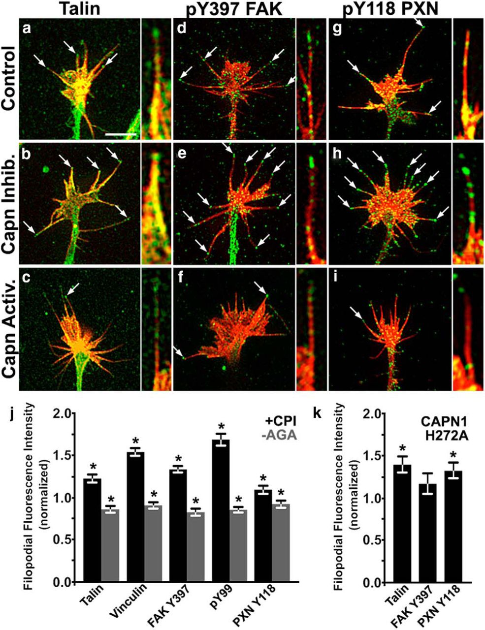 Calpain activity regulates adhesion protein localization and signaling in filopodia. aâi, Immunocytochemistry experiments were performed with cultured Xenopus spinal neurons plated on laminin. The fluorescence intensity within filopodia was quantified in the following three conditions: control, with 1 μm CPI (calpain inhibition), or without AGAs (âAGAs, calpain activation). aâi, Representative images of growth cones (left) and filopodia (right) shown for selected adhesion proteins, as follows: talin (aâc), phospho-tyrosine 397 FAK (FAK Y397; bâh), and phospho-tyrosine 118 paxillin (PXN Y118; câi). Immunolabeled adhesion proteins are in green, and phallodin-labeled F-actin is in red. Arrows indicate localization to filopodial tips. j, Quantification of filopodial fluorescence intensity of all adhesion markers tested, including vinculin and total phospho-tyrosine (pY99), with inhibition of calpain or Ca2+-dependent activation of calpain by removal of AGAs. k, Quantification of filopodial fluorescence intensity of talin, FAK Y397, and PXN Y118 in growth cones expressing GFP-tagged dominant-negative calpain1 (H272A) normalized to cocultured wild-type neurons. Scale bar, 5 μm. n > 60 growth cones and n > 3 cultures for all conditions. *p < 0.05, MannâWhitney U test. |