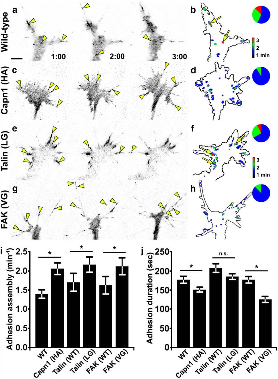 Calpain regulates adhesion dynamics through the cleavage of talin and FAK. aâh, Inverted contrast TIRF images of growth cones expressing paxillin-GFP or paxillin-tdTomato displayed every 1 min over a 3 min period in wild-type- (a, b), dominant-negative calpain1 (H272A; c, d), calpain-resistant talin- (L432G; e, f), or calpain-resistant FAK (V744G; g, h)-expressing neurons. Arrowheads denote new adhesions formed. b, d, f, h, Adhesion lifetime heat maps exhibit adhesion dynamics from the corresponding time points. Arrows represent the stable adhesions that have a lifetime between 2 and 3 min. The inset pie charts demonstrate the proportion of adhesions with lifetimes of 0â1 min (blue), 1â2 min (green), and 2â3 min (red). i, j, Quantification of adhesion formation (i) and duration (j) for wild-type-, capn1âH272A-, talin-WT-, talin-L432G-, FAK-WT-, and FAK-V744G-expressing growth cones. Statistical comparisons were made between wild-type- and capn1-H272A-, talin-WT- and talin-L432G-, and FAK-WT- and FAK-V744G-expressing growth cones. Scale bar, 5 μm. n > 100 adhesions and n > 11 growth cones for each condition. *p < 0.05, MannâWhitney U test or Student's t test. |