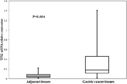METHODS: Tumor samples were obtained from 290 patients with gastric adenocarcinoma who had undergone gastrectomy. The expression of TPX2 protein was examined using immunohistochemical staining. TPX2 messenger RNA (mRNA) levels were evaluated using real-time quantitative reverse transcription PCR in 19 of the gastric cancer tumors and adjacent normal tissues.