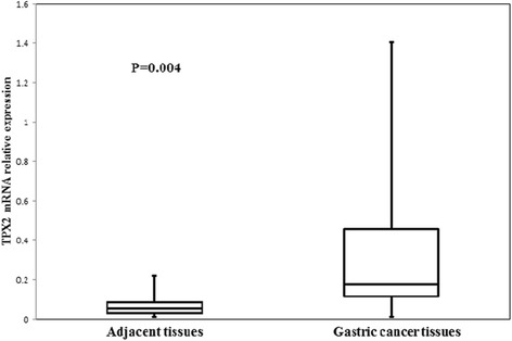 Fig. 1. Targeting protein for Xenopus kinesin-like protein 2 (TPX2) mRNA expression in gastric cancerous and adjacent normal tissues. The median TPX2 mRNA level was significantly higher in gastric cancer than in the adjacent normal tissue in 19 patients (p = 0.004)