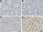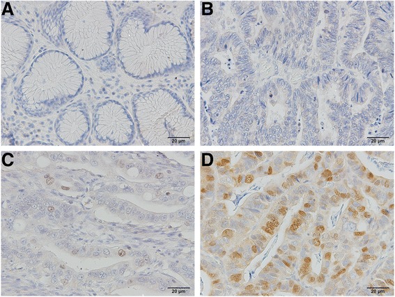 Fig. 2. Representative photomicrographs of immunostaining for targeting protein for Xenopus kinesin-like protein 2 (TPX2), demonstrating a negative staining in normal gastric epithelium, b negative staining in primary gastric carcinoma, c positive staining graded as low (<5% of tumor cells stained), and d positive staining graded as high (≥5% of tumor cells stained). TPX2 protein was mainly localized within the nuclei of tumor cells. Images were captured at ×200 magnification