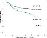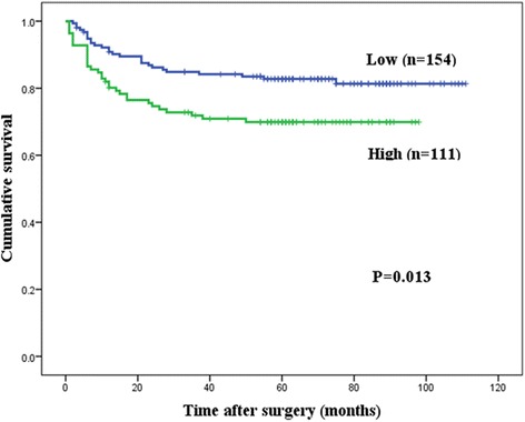 Fig. 4. Kaplan-Meier curves for the relapse-free interval (RFI) of patients with targeting protein for Xenopus kinesin-like protein 2 (TPX2) expression. Patients with high TPX2 protein expression (n = 123) had significantly poorer RFI than those with low TPX2 expression (n = 167; p = 0.013)