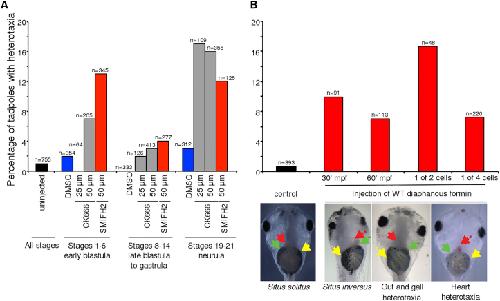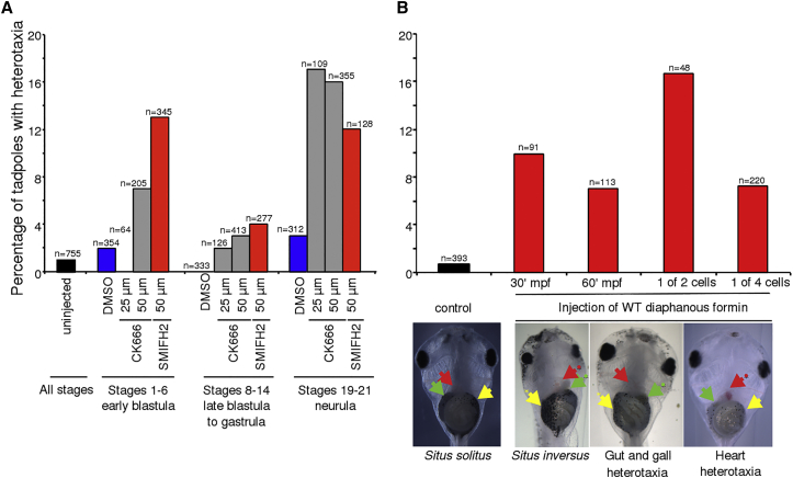 (A) Embryos were treated with DMSO, CK-666, or SMIFH2 at the concentrations indicated, allowed to develop, and scored for visceral organ chirality at stage 45.