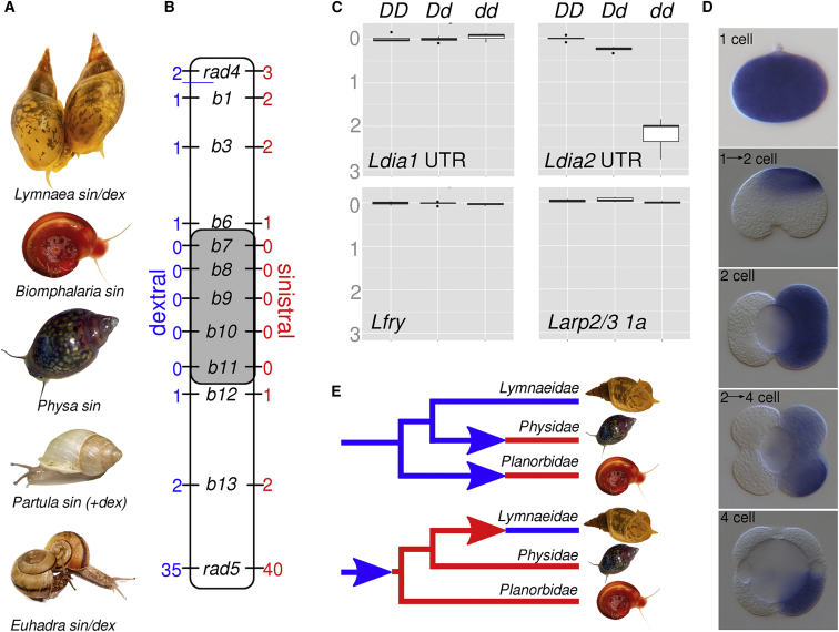 Figure 1. Mapping the Formin Gene, Maternal Expression, and Evolution of Chirality(A) The snail genera used in this study (image credits: Lymnaea [E. de Roij], Biomphalaria and Physa [creative commons], Partula and Euhadra [A.D.]).(B) 3,403 offspring were used to infer the recombination breakpoints that bound the D locus. Numbers of mapped recombinants for 1,507 sinistral (dd) snails are shown on the right and for 1,896 dextral (DD or Dd) on the left. The sinistral mutation must be between loci b6 and b12 (shaded), a region that spans 267 kb (not to scale).(C) Boxplots show normalized relative quantities (NRQs), on log scale, of quantitative real-time PCR assays of transcripts of three candidate genes and one control (Larp2/3 1a) in single-cell egg samples from dextral homozygote (DD), dextral heterozygote (Dd), and sinistral recessive homozygote (dd) individuals. Significant differences in expression were detected for Ldia2 only (DD:dd, p = 0.002; DD:Dd and Dd:dd, p = 0.004).(D) WMISH of maternal Ldia transcripts in early, dextral L. stagnalis embryos.(E) Schematic showing two hypotheses for the evolution of chirality in three snail families (dextral = blue; sinistral = red). Either sinistrality evolved once from a dextral ancestor, with the ancestral Lymnaeid reverting to dextral (bottom), or sinistrality evolved twice (top).See also Table S1 for the mapping data; Figure S3 for further WMISH and quantitative real-time PCR data; and Figure S2C for the full snail phylogeny.