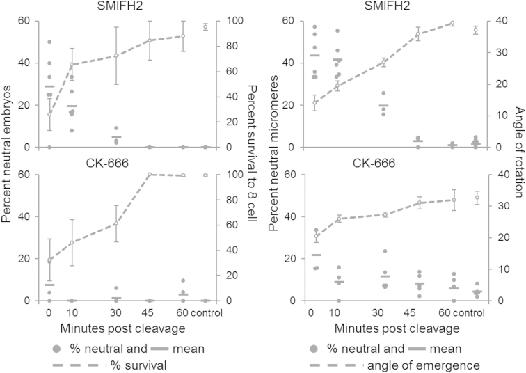 Figure 2. Impact of Drug Treatment upon 4-Cell Snail EmbryosWhen applied shortly after the second cleavage had completed, both SMIFH2 and CK-666 reduced the proportion of embryos that survived to the 8-cell stage (left-hand graphs). Following SMIFH2 treatment (top left), a high proportion of the viable embryos emerged neutrally, without a chiral twist. In contrast, the proportion of neutral embryos following CK-666 treatment (bottom left) was low. Both drugs reduce the angle of rotation as the micromeres emerge (right-hand graphs). Mean values for each experiment and SE are shown. See also Table S2 and Movie S1.