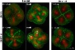Figure 3. Tubulin and Actin Staining of Control and Drug-Treated EmbryosEmbryos were fixed and stained with Cy3-b-tubulin (red) and 488-phalloidin (green) to highlight the spindle microtubules and filamentous actin, respectively. DMSO-treated embryos predominantly showed spindle inclination (left image, 4-cell stage), with the micromeres usually emerging with a dextral twist (right image, 8-cell stage). A minority of SMIFH2 treated embryos had mitotic spindles that showed a radial orientation (left image), an arrangement that was not observed in DMSO control dextral embryos. In the SMIFH2 right-hand image (8-cell stage), the top middle and middle left micromeres are emerging neutrally (arrows), with the other two showing a partial rotation. Addition of SMIFH2 did not influence spindle orientation in 4-cell DMSO control or sinistral embryos, with spindles typically showing a radial orientation.