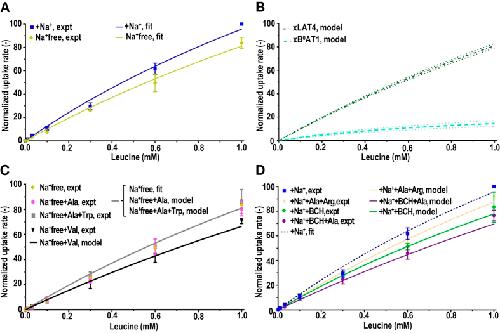Figure 3. L-leucine uptake by endogenous Xenopus laevis oocyte transporters.Three minute uptakes by non-injected (NI) oocytes of 10–1000 μM L-leucine (Leu) in uptake buffers containing (+Na+) and without sodium (Na+free) were tested using radiolabeled amino acid (AA) tracers. In all panels uptake data (pmol/3 min per oocyte) were normalized to uptake in 1 mM Leu, +Na+ uptake buffer for each batch of oocytes and experimental day. Panel (A) shows normalized Leu uptake rate data (expt) vs. the simultaneous fit (fit) for endogenous Leu uptake rates. Panel (B) shows model calculations (model) for contributions to uptake of 10–1000 μM Leu by various endogenous Xenopus laevis oocyte (xAAT) species. Model output was calculated based on the calculated xAAT Vmax,i and the reported Km for each xAAT ortholog (Table 1). The 95% confidence limits for transporter activities are shown (dotted lines) bracketing the model predictions. Panels (C,D) show the calculated Leu uptake rates in +Na+ and Na+ free uptake buffers containing excess competitive inhibitors. Panel (C) shows the concentration dependence (0–1000 μM Leu) of normalized cumulative uptake data by NI oocytes in Na+free uptake buffers containing 10 mM each of the following competitors: L-alanine (Ala) (Na+free+Ala), Ala and L-tryptophan (Trp) (Na+free+Ala+Trp), L-valine (Val) (Na+free+Val) vs. calculated cumulative endogenous uptake results for the respective uptake buffers. For uptakes in Na+free+Ala, and Na+free+Ala+Trp uptake buffers, the calculated values were virtually indistinguishable from the global fit for the Na+free data, therefore a single line was used for graphing all three data sets. Panel (D) shows the concentration dependence (0–1000 μM) of total Leu uptake rates in +Na+ uptake buffers containing 10 mM each of the following competitors: Ala, Arg (+Na++Ala+Arg), 2-aminobicyclo-(2,2,1)-heptane-2-carboxylic acid (BCH) (+Na++BCH), and BCH and Ala (+Na++BCH+Ala) (Fig. 2). n = 6–8 ooyctes each experiment, for 3 independent experiments. The experimental data are shown as the mean ± SEM for the measured uptake rates and the calculated cumulative endogenous uptake rates were based on the previously calculated Vmax and reported Km values for the kinetic components exhibited by each AAT species (Table 1).