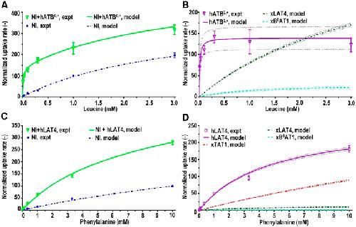 Figure 4. L-leucine and L-phenylalanine uptake by endogenous Xenopus laevis oocyte and exogenously expressed human sodium-dependent symporter SLC6A14/ATB0,+ and sodium-independent uniporter SLC43A2/LAT4 transporters.L-Leucine (Leu) uptake rates (pmol/3 min per oocyte) from non-injected (NI) and oocytes expressing human ATB0,+ (hATB0,+) were compared with model calculations. Measured uptake data (pmol/10 min per oocyte) for each batch of oocytes and experimental day was normalized to uptake rates by NI oocytes in 1 mM Leu, +Na+ uptake buffer. Panel (A) shows measured Leu (10–3000 μM) uptake rates for NI oocytes (NI, expt), and for oocytes expressing hATB0,+ without subtraction of NI uptake data (NI+hATB0,+, expt) vs. the calculated model outputs for the respective oocytes (NI, model; and NI+ATB0+, model). Panel (B) shows experimental data for total Leu (0–3000 uM) uptake rates by hATB0,+ expressing oocytes with subtraction of NI oocyte uptake rates (+hATB0,+, expt) vs. calculated Leu uptake by endogenous Xenopus laevis oocyte Leu transporters (xB0AT1, model; and xLAT4, model) and exogenous hATB0,+ transporters (+hATB0,+, model). n = 6–8 oocytes per experiment for 7 independent experiments. Panels (C,D) show L-phenylalanine (Phe) uptake data (pmol/10 min per oocyte) in Na+ containing uptake buffer vs. model calculations for endogenous Phe transporters (xB0AT1, xLAT4, xTAT1) and human LAT4 (hLAT4) transporters. Experimental uptake (pmol/10 min per oocyte) for all oocytes was normalized to uptake in 10 mM Phe, Na+ containing- uptake buffer (Na+). Panel (C) shows normalized total Phe uptake rates by NI oocytes (NI, expt) vs. oocytes with expressed hLAT4 without subtraction of NI oocyte uptake (NI+hLAT4, expt) vs. calculated data for the respective oocyte uptakes (NI, model; and NI+hLAT4, model). Panel (D) shows the normalized data for 0–10 mM Phe uptake rates by oocytes exogenously expressing hLAT4 with subtraction of NI uptake (hLAT4, expt) vs. model calculations for hLAT4 (hLAT4, model) and xAAT Phe transporters (xB0AT1, model; xLAT4, model; and xTAT1, model). n = 6–8 oocytes each experiment for 4 independent experiments. For panels (B,D), 95% confidence limits for predicted transporter activities are shown (dotted lines) bracketing the model predictions for each AAT activity.