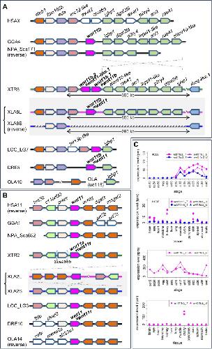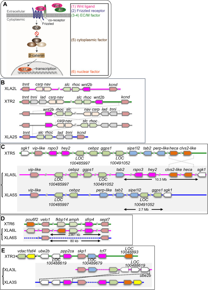 Syntenic analyses of Wnt signaling-related singletons inX. laevisandX. tropicalis. (A) Schematic view of the Wnt signaling pathway. Categories based on subcellular localization are indicated at the right. (B) Synteny around wnt2b. XLA2L retains conserved synteny around wnt2b with X. tropicalis chromosome 2 (XTR2), but several rearrangements may have occurred in XLA2S. (C) Synteny around rspo3. Complicated rearrangements were observed on both L and S chromosomes. (D) Comparison of sfrp4 loci. sfrp4.S was lost in a large deletion (~23 Mb) between velo1 and sept7 on XLA6S. (E) Comparison of genomic loci surrounding ppp2ca and tcf7. XLA3S retains conserved synteny with XTR3, even though LOC100489679 was deleted. On the other hand, XLA3L lost tcf7 and there was a large inversion close to vdac1.L. In addition, a pseudogene of ppp2ca.L, shown with a dashed box, was found between vdac1.L and LOC100488619.L. Magenta boxes show singletons involved in Wnt signaling, except hey2 in (C), which is related to Notch signaling. Double diagonal lines indicate a large gap between genes. Diagonal lines on the genome signify deletion of genes. Dashed lines represent putative inversion events. In each panel, only representative gene models are shown for comparison. |