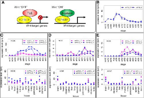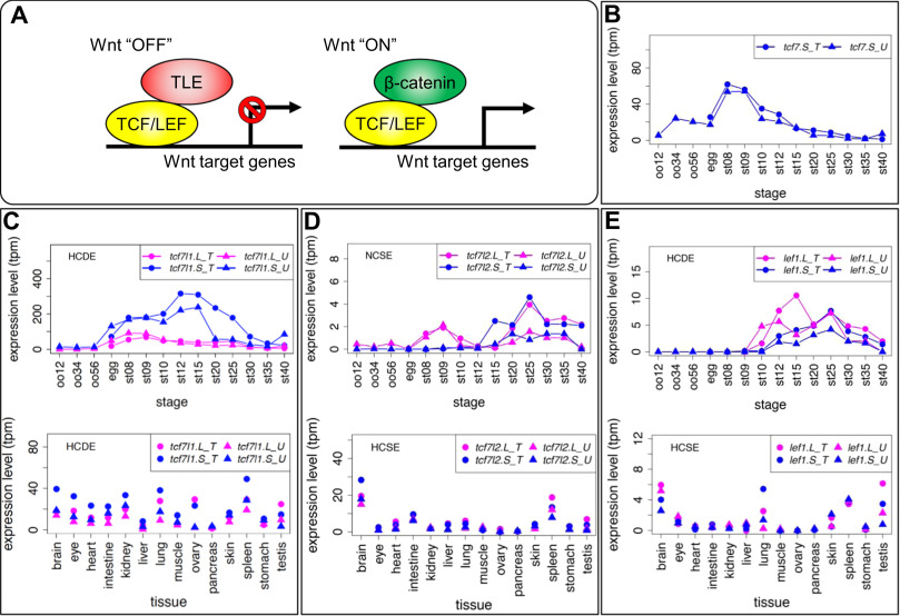 Variable expression patterns of Tcf/Lef genes. (A) Schematic drawing of transcriptional regulation for Wnt target genes by Tcf/Lef. The Tcf family has a β-catenin-binding domain and a TLE/Groucho-binding domain in addition to the HMG box DNA-binding domain. When canonical Wnt signaling is off, Tcf protein represses target genes by forming a complex with TLE transcriptional corepressors. When canonical Wnt signaling is activated, β-catenin accumulates in the nucleus, Tcf forms a complex with β-catenin, and recruits other coactivators for transcription of target genes. (B-E) Expression profiles of tcf/lef genes. Data are shown in graphs similar to those in Fig. 1. See text for detailed explanations of variable expression profiles. |