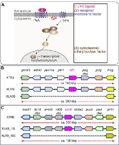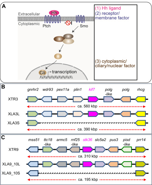 Schematic view of Hh signaling and syntenic analyses of its singletons. (A) Overview of the Hedgehog (Hh) signaling pathway. Categories based on subcellular localization are indicated at the right. (B-C) A schematic comparison of syntenies around kif7 (B) and stk36 (C) in X. tropicalis and X. laevis. Only representative gene models are listed for comparison. Regions where corresponding gene models are missing on S chromosomes are outlined in gray. |