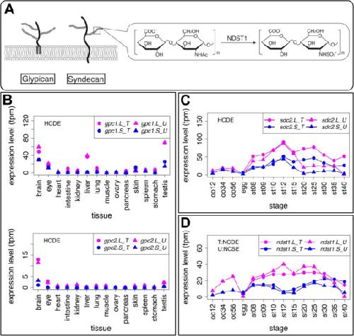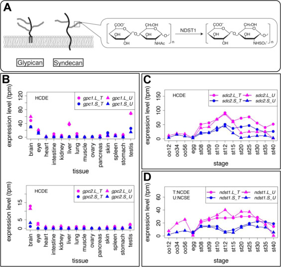 Genes involved in heparan sulfate proteoglycans also showed variable expression profiles. (A) Schematic diagram of Glypican (Gpc) and Syndecan (Sdc). Solid lines and branches show core protein and glycosaminoglycan chains, respectively. N-deacetylase/N-sulfotransferase (NDST) removes N-acetyl groups from GlcNAc of nascent sugar chains (N-acetyl heparosan) and substitutes the free amino group with sulfate (N-sulfo HS). (B-D) Expression profiles of gpc1, gpc2, sdc4, and ndst1. Transcriptomic data are shown in graphs similar to those in Fig. 1. See text for detailed explanations of variable expression. |