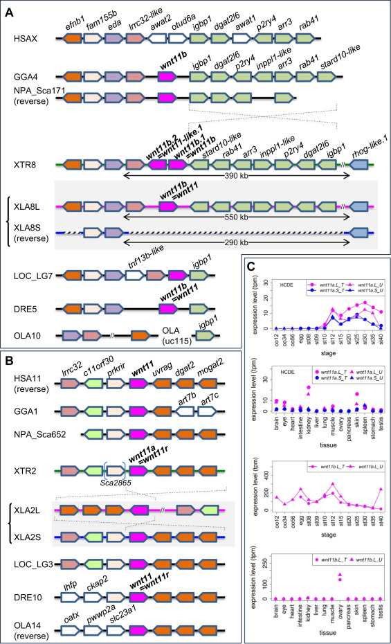 Frequent loss ofwnt11bgenes in vertebrate lineages and variable expression patterns ofwnt11ahomeologs. (A) Synteny around the wnt11b gene in vertebrates. wnt11b.S was deleted from X. laevis chromosome 8S (XLA8S) together with neighboring genes. Orthologs of wnt11b were also deleted in humans (HSAX) and medaka (OLA10). After the divergence of Xenopus and Nanorana, a large inversion seems to have occurred between igbp1 and stard10-like, as indicated by dashed lines. (B) Synteny around the wnt11a gene in vertebrates. Although a genomic rearrangement was found in XLA2L, wnt11a orthologs and synteny are highly conserved among vertebrates. HSA, Homo sapiens; GGA, Gallus gallus (chicken); NPA, Nanorana parkeri (Tibetan frog), XTR, Xenopus tropicalis; XLA, Xenopus laevis; LOC, Lepisosteus oculatus (spotted gar); DRE, Danio rerio (zebrafish); OLA, Oryzias latipes (medaka). (C) Expression profiles of wnt11a.L, wnt11a.S and wnt11b.L. Data are shown in graphs similar to those in Fig. 1. See text for detailed explanations of variable expression profiles. |