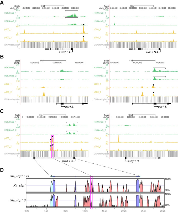 Correlations of epigenetic states and variable expression profiles. (A-C) Genome browser representations of ChIP-seq and DNA methylation data using X. laevis gastrula embryos (st10.5) demonstrated biased enrichment of H3K4me3 and p300 between homeologous genomic regions near axin2, cer1, and sfrp1. ChIP-seq results from biological replicates are shown separately. Green, H3K4me3; yellow, p300; gray, DNA methylation; bracket, strong enrichment of H3K4me3 on the promoter of the more strongly expressed homeolog; arrowhead, strong enrichment of p300 on enhancers of the more strongly expressed homeolog. (D) A vista plot represents sequence conservation in the genomic region around sfrp1 in X. laevis and X. tropicalis. The sequence of sfrp1.L was used as a reference. Light blue, UTR; dark blue, coding sequences; orange, conserved non-coding sequences. Dashed lines and magenta boxes in (C) and (D) correspond to each other. |