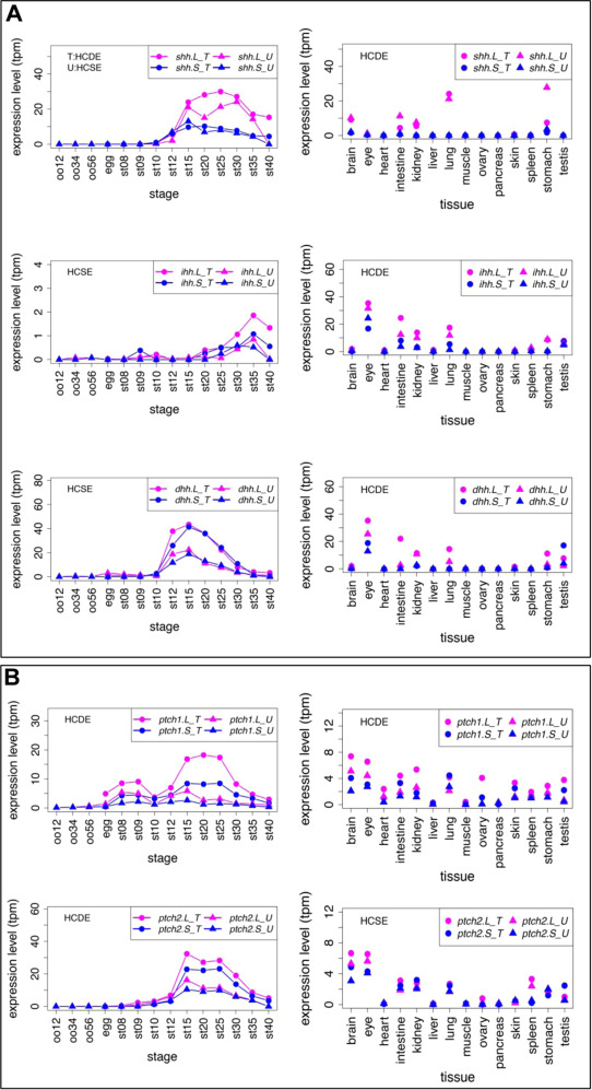 Variable expression profiles of Hh ligands and Ptch receptors. (A) Expression profiles of Hh ligands. (B) Expression profiles of Ptch receptors. Transcriptomic data are shown in graphs similar to those in Fig. 1. See text for detailed explanations of differential expression. |