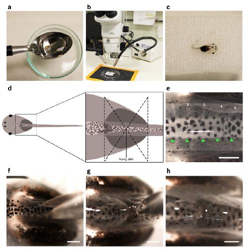 Figure 1 | Spinal cord transection surgery in stage 50 larvae. (a) Stage 50 larvae are transferred from an anesthetic bath to a gauze using a spoon to avoid any damage. (b,c) Larvae are placed dorsal side up on the gauze under the dissecting microscope. (d) Schematic diagram showing location of the injury site at the thoracic level of the spinal cord. (e) Identification of the third and fourth peripheral nerves by white lines or green arrowheads. (f) Scissors position right before transection. (g) Straight cut through skin, muscle and spinal cord. (h) Larva after spinal cord transection. Scale bars, 200 μm. Spinal cord injury in larvae was performed in compliance with the institutional bioethics and biosafety committee at the Pontificia Universidad CatoÂÂÂÂ?lica de Chile.