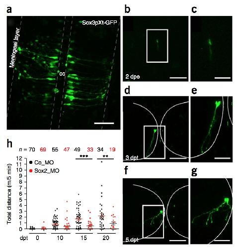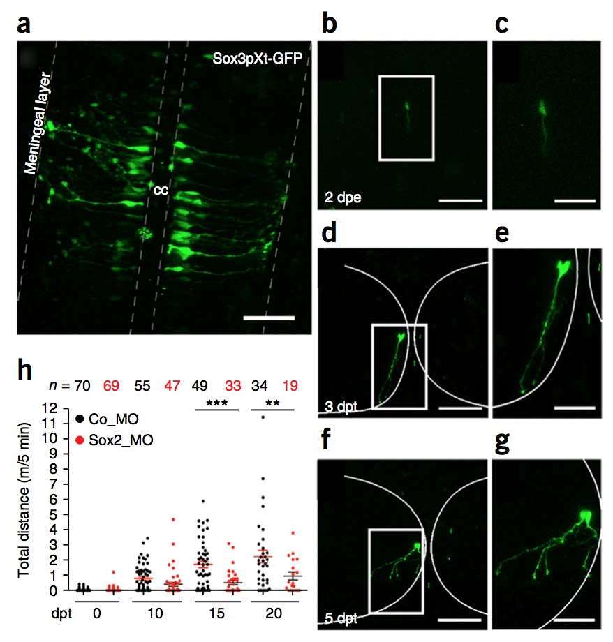 Figure 5 | Sox3pXt-GFP+ cells after spinal cord electroporation. (a) GFP expression 2 d after electroporation of Sox3pXt-GFP into the central canal (cc) of the larvae spinal cord. The morphology clearly shows that GFP+ cells have radial glia morphology. (b–g) Z stack of in vivo imaging of Sox3pXt-GFP+ electroporated cells (b) 2 dpe (days after electroporation) and (d,f) 3–5 dpt (days after transection), showing differentiation to neuronal morphology. White boxed areas in b,d,f are the magnified areas indicated in c,e,g and show the neural morphology of the electroporated cells. (h) Trajectory of swimming records of larvae electroporated with control morpholino (Co_MO; black dots) and Sox2 morpholino (Sox2_MO; red dots). Results for swimming records were analyzed by one-way ANOVA and Bonferroni multiple comparison test. Error bars indicate the s.e.m.(**P < 0.01; ***P < 0.001, indicates statistically significant). The decrease in Sox2_MO electroporated animals is explained because of animal death specific to the knockdown of Sox2. Scale bars, 50 μm (a,b,d,f); 100 μm (c,e,g). Spinal cord electroporation and swimming behavior test in larvae were performed in compliance with the institutional Bioethics and Biosafety committee at the Pontificia Universidad Catolica de Chile. b–h adapted with permission from ref. 10, Elsevier.