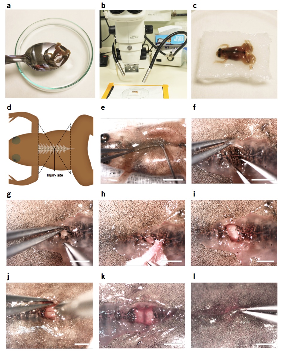 Figure 2 | Spinal cord transection surgery in stage 66 froglets. (a) Stage 66 froglets are transferred from anesthetic to a gauze using a spoon to avoid any damage. (b,c) Froglets are placed dorsal side up on the gauze under the dissecting microscope. (d) Schematic diagram showing the location of the injury site at the thoracic level of the spinal cord. (e) First incision in the skin and muscle with the tip of a 23-gauge needle. (f) Skin and muscle separation to access the dorsal region of the vertebrae. (g) Laminectomy of one vertebra using forceps. (h) Blood should be cleaned with tissue paper. (i) Spinal cord is exposed to proceed with spinal cord transection. (j) Incision across the spinal cord using microdissection scissors. (k) Spinal cord incision. (l) Closure of the injury extending the muscle and then the skin from one side over the other. Scale bars, 5 mm (e); 1.5 mm (f–l). Spinal cord injury in froglets was performed in compliance with the institutional bioethics and biosafety committee at the Pontificia Universidad Catolica de Chile.