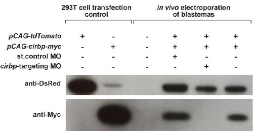 Figure S2. Administration of cirbp-targeting morpholino diminishes CIRBP protein level in axolotl tissue. Related to Figure 4. Shown is a western blot labeled with anti-DsRed (top) and anti-myc (bottom) antibodies. On the left are protein samples from HEK293T cells transfected with DNA constructs as shown for validation of protein size and as positive controls. On the right are protein samples from blastemas electroporated with DNA constructs and either the standard control morpholino (st. control MO) or the cirbp-targeting morpholino (cirbp-targeting MO). Each lane was loaded with 2 μg of total protein. |