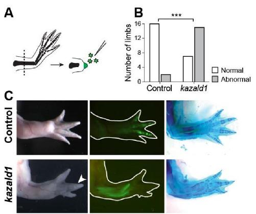Figure S6. Expression of the most robust blastema marker must be temporally or spatially restricted to achieve perfect regeneration. Related to Figure 5. (A) Experimental setup for virus-driven constitutive misexpression. (B) Prolonged misexpression of kazald1 causes profound regenerative defects as compared to controls (n=22 experimental, 18 control; p=0.004 with Fisher’s exact test). (C) The most common defect observed was syndactyly (indicated by arrow). Scale bar is 500 microns. |