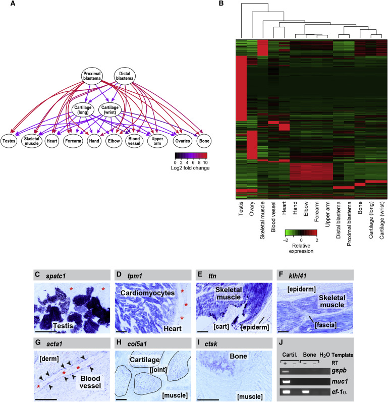 Figure 2. Differential Gene Expression Analysis across Each Set of Tissues Identifies Transcripts Most Enriched in Specific Tissue Types (A) Graph illustrating the methodology for the identification of genes that are tissue enriched in the context of all tissue pairwise comparisons using kazal-type serine peptidase inhibitor domain 1 (kazald1) as an example. Directed edges are drawn from upregulated to downregulated tissues, and fold changes in expression are indicated by edge colors. (B) Heatmap showing all transcripts that are enriched in specific tissue types. (C–J) RNA in situ hybridization performed on tissue sections. (C) speriolin (spatc1) is enriched in the germ cells in the testes but is not detectable in adjacent support cells (asterisks). (D) tropomyosin 1 (tpm1) is enriched in cardiomyocytes within the heart and not detectably expressed by other heart cell types such as epicardium (asterisks). (E) titin (ttn) is enriched in limb skeletal muscle but is not detectable in adjacent cartilage (cart) and epidermis (epiderm). (F) kelch repeat and BTB domain-containing protein 10 (klhl41) is highly enriched in skeletal muscle and not detectable in adjacent tissues such as epidermis (epiderm) and fascia. (G) actin, alpha 1, skeletal muscle (acta1) mRNA is enriched in the very thin layer of vascular endothelial cells lining the blood vessels (arrowheads) and absent from adjacent dermis (derm). Asterisks mark red blood cell clumps in the vessel lumen. (H) collagen type V alpha 1 (col5a1) expression is highly enriched in cartilage; shown are four carpals (outlined) within the wrist. Expression in joint (between carpals) and adjacent muscle is diminished. (I) A bone-enriched marker, cathepsin k (ctsk), is highly expressed in ossified portions of the humerus and low in adjacent muscle. (J) platelet-binding protein GspB (gspb) and mucin 1 (muc1) are detected in cartilage but not in bone by RT-PCR. eukaryotic translation elongation factor 1 alpha 1 (ef-1a) serves as the loading control. Scale bars, 100 μm. See also Figure S7, Tables S2 and S3, and Data S1, S2, S3, S4, and S5. |
