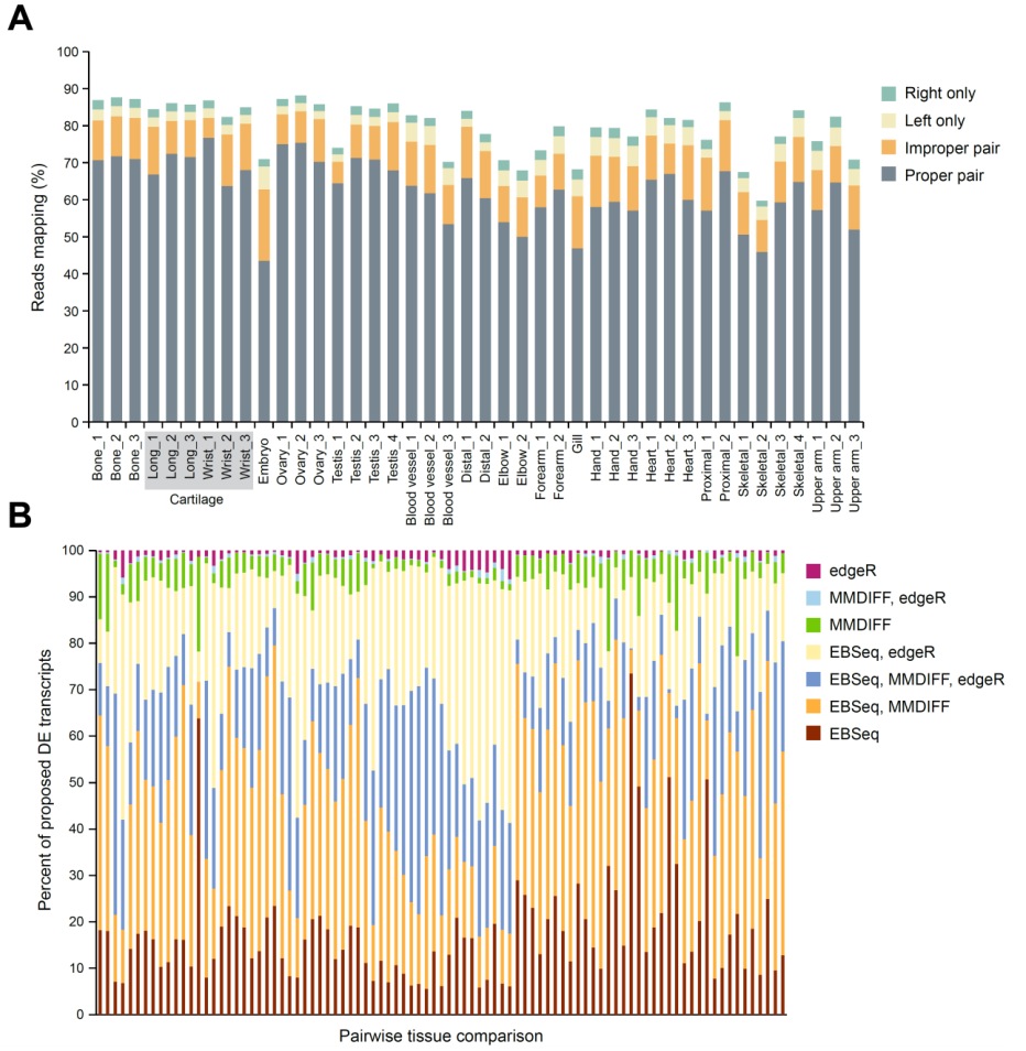 Figure S1. Transcriptome read representation and comparison of methods for differential gene expression analysis. Related to Figure 1 and Table 1. (A) Approximately 80% of RNA-Seq reads from each sample and replicate are represented by the transcriptome assembly. (B) Most transcripts identified as significantly differentially expressed were agreed upon by at least two different computational methods. |