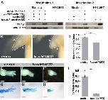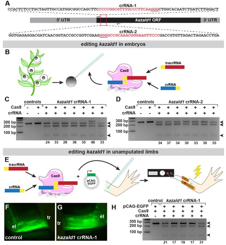 Figure S5. CRISPR-mediated deletions in kazald1 locus in embryos and unamputated limbs. Related to Figure 5. (A) Kazald1 genomic locus and targeting scheme. Primers for PCR amplification for genotyping are indicated. (B) Experimental schematic for targeting in embryos via injection. (C-D) Embryo genotyping via PCR followed by T7 endonuclease assay for embryos injected with crRNA-1 (C) and crRNA-2 (D). (E) Experimental schematic for targeting in unamputated limbs via electroporation. (F-G) EGFP expression in control (F, left limb) and crRNA-1-treated (G, right limb) limbs at 25 days post-electroporation. Landmarks: el (elbow), tr (trunk). (H) Limb genotyping via PCR followed by T7 endonuclease assay. For all genotyping, each lane indicates an individual specimen. Editing efficiency is estimated by the indel percentage beneath each lane. |