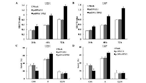 Figure 2. TPX2 overexpression promotes cell proliferation in U251 and U87 cells. (A and B) TPX2 overexpression significantly promotes the proliferation of (A) U251 and (B) U87 glioma cells at different time points. (C and D) TPX2 overexpression led to a reduced number of (C) U251 and (D) U87 glioma cells in G0/G1 phase and an increased number of cells in S phase. Data are presented as the mean +standard deviation of three independent experiments. *P<0.05. TPX2, targeting protein for Xenopus kinesin-like protein 2; OD, optical density.