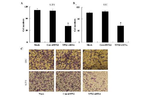 Figure 6. TPX2 knockdown suppresses the invasion capacity of (A) U251 and (B) U87 cells. (A-C) U251 and U87 cells were examined for cell invasion in 24-well plates with Transwell chambers. (C) The migrated cells were stained with crystal violet and observed under a light microscope (magnification, ×200). The invasiveness of U251 and U87 cells was attenuated with TPX2 knockdown. *P<0.05. TPX2, targeting protein for Xenopus kinesin-like protein 2; Con, control; siRNA, small interfering RNA.