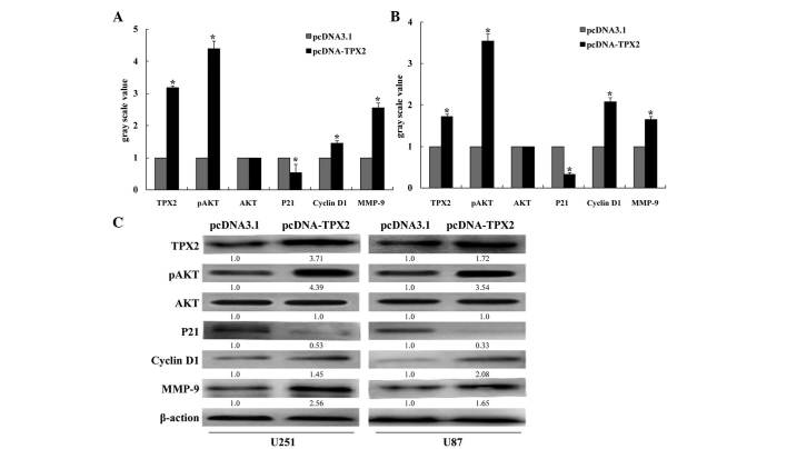 Figure 4. TPX2 overexpression activates AKT signaling pathway in (A) U251 and (B) U87 cells. (C) Western blot analysis of TPX2, pAKT, AKT, p21, cyclin D1 and MMP-9 expression in cells transfected with pcDNA-TPX2 or pcDNA3.1. β-actin served as the loading control (*P<0.05). TPX2, targeting protein for Xenopus kinesin-like protein 2; MMP, matrix metallopeptidase; p, phosphorylated.