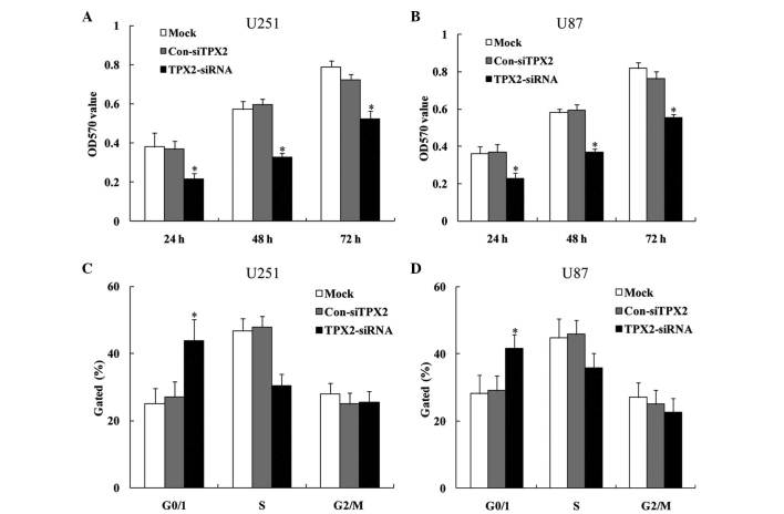 Figure 5. TPX2 knockdown suppresses cell proliferation in U251 and U87 cells. (A and B) TPX2 knockdown significantly suppressed the proliferation of (A) U251 and (B) U87 glioma cells at different time points. (C and D) TPX2 knockdown resulted in an increased number of (C) U251 and (D) U87 glioma cells in G0/G1 phase and a reduced number of cells in S phase. Data are the mean + standard deviation of three independent experiments. *P<0.05. TPX2, targeting protein for Xenopus kinesin-like protein 2; Con, control; siRNA, small interfering RNA; OD, optical density.