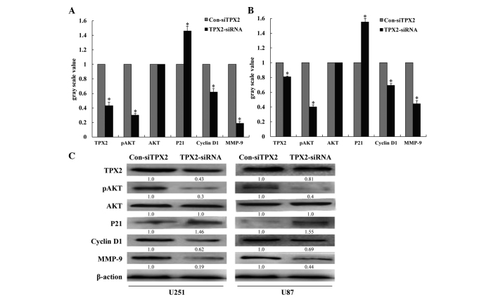 Figure 7. TPX2 knockdown inhibits AKT signaling pathway in (A) U251 and (B) U87 cells. (C) Western blot analysis of TPX2, pAKT, AKT, p21, cyclin D1 and MMP-9 expression in cells transfected with TPX2-siRNA or Con-siRNA. β-actin served as the loading control (*P<0.05). TPX2, targeting protein for Xenopus kinesin-like protein 2; MMP, matrix metallopeptidase; p, phosphorylated; Con, control; siRNA, small interfering RNA.