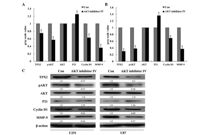 Figure 8. AKT inhibitor IV inhibits TPX2 expression and AKT signaling pathway in (A) U251 and (B) U87 cells. (C) Western blot analysis of TPX2, pAKT, AKT, p21, cyclin D1 and MMP-9 expression following AKT inhibitor IV treatment. β-actin served as the loading control (*P<0.05). TPX2, targeting protein for Xenopus kinesin-like protein 2; MMP, matrix metallopeptidase; p, phosphorylated; Con, control; siRNA, small interfering RNA.