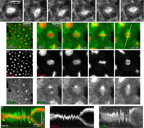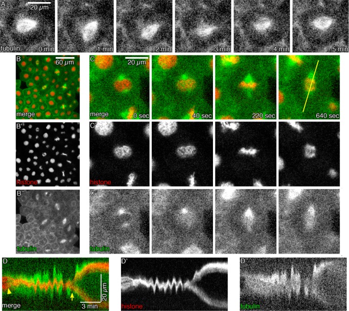 FIGURE 1:. Tubulin and histone highlight mitotic landmarks. (A) eGFPâα-tubulin (GFP-Tub) highlights the highly dynamic mitotic spindle in the X. laevis embryo. (B) X. laevis gastrula animal caps contain a field of asynchronous epithelial cells, visualized with mCherry-histone H2B (mChe-H2B; Bâ²) and GFP-Tub (Bâ²â²). (C) Mitotic temporal landmarks are apparent in cells expressing mChe-H2B and GFP-Tub, including NEB (frames 1 and 2), formation of the metaphase plate (frame 3), and segregation of chromosomes in anaphase (frame 4). The line in frame 4 through the spindle poles at anaphase onset was used to generate a kymograph (D), highlighting NEB (arrowhead), anaphase onset (arrow), and spindle movements in preanaphase period. |
