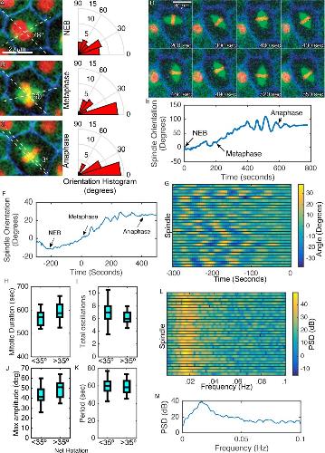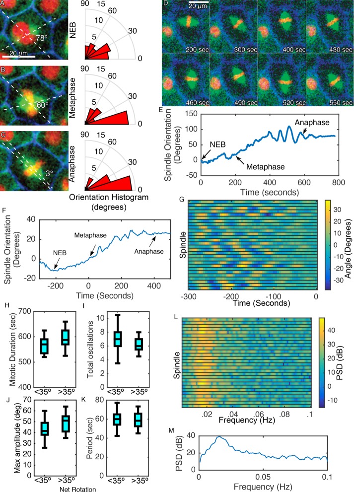 FIGURE 3:. Mitotic spindles display stereotyped alignment and oscillatory rotational dynamics. The angle between centrosomes/spindle poles and the long axis of the cell at anaphase was measured in 28 cells at (A) NEB, (B) metaphase, and (C) anaphase in cells expressing BFP-CAAX, GFP-Tub, and mChe-H2B. (D) Mitotic spindles display dynamic movement, featuring preanaphase oscillations when spindle orientation is plotted (E). (F) Average spindle orientation over time for 28 manually analyzed spindles. Time 0 indicates approximate time of metaphase plate formation. (G) Twenty-eight spindles all demonstrate rotational oscillations before anaphase onset (time 0). Spindles grouped by net rotation between NEB and anaphase onset show no significant difference in (H) mitotic duration, (I) total oscillations, (J) maximum amplitude of oscillation, or (K) periodicity of oscillation. (L) Power spectral density of corresponding spindle traces from G, indicating the oscillatory frequency of each spindle. (M) Average of PSDs from L, indicating a dominant oscillatory frequency of 0.01562 Hz (period of 64 s). |