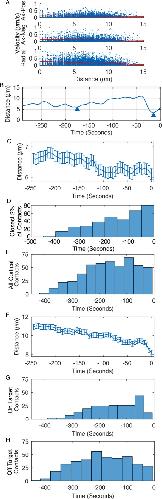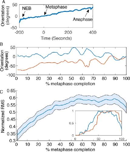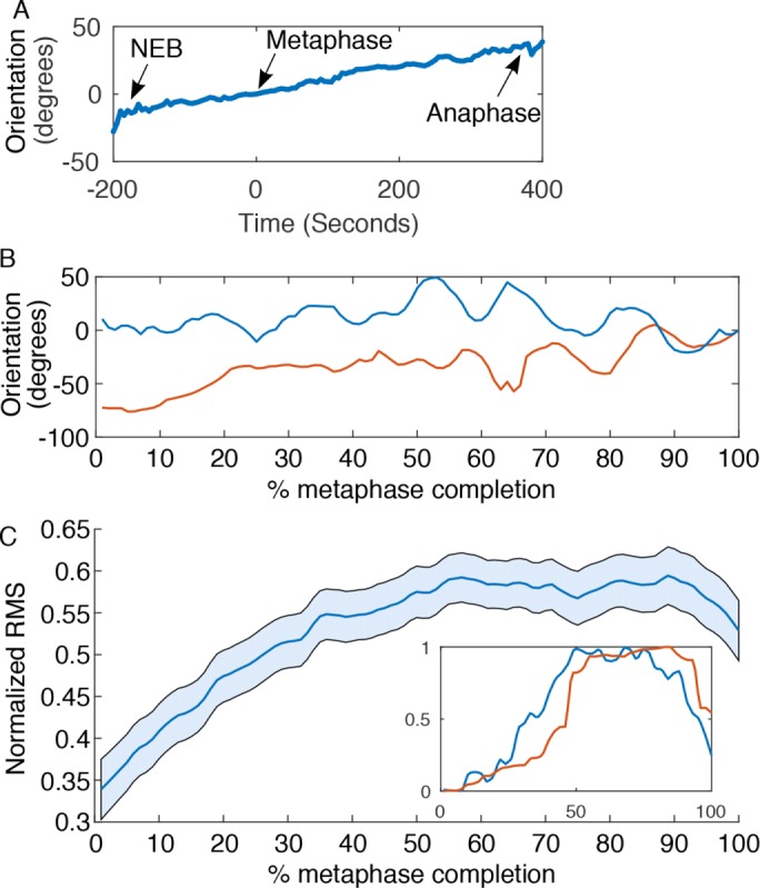 FIGURE 5:. Analysis of oscillations reveals biphasic movement. (A) Average of 100 rotational trajectories reveals net rotation through mitosis, with slight apparent oscillation and decrease in net rotation toward anaphase onset. (B) Rotational traces of two spindles, one that is prealigned with the anaphase axis and one that is not. (C) Average normalized RMS of spindle rotational acceleration over 2-min intervals (24 frames) of 100 spindles during metaphase. This metric will be 0 if the spindle is still or has a constant rotational velocity and increases with greater changes in velocity over the 2-min intervals. RMS is low at early time points and steadily increases to a plateau, indicating that rotational velocity is more constant in early metaphase, consistent with a rotational but nonoscillatory regime, followed by a period of more tumultuous acceleration, indicative of oscillation. Inset, sample RMS traces corresponding to the rotational traces in B. |