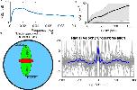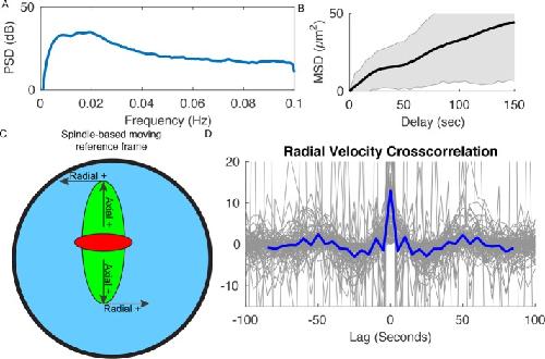 FIGURE 7:. Analysis of spindle pole movements. (A) Averaged power spectral density of 100 automatically calculated spindle rotational trajectories in the 150 s before anaphase onset reveals a similar maximum to that seen in manually analyzed spindles. (B) Mean square displacement of 200 metaphase spindle pole locations reveals an initial supralinear (directed) behavior and later infralinear (restricted) behavior. Black line represents mean MSD; gray areas indicates SD. (C) Diagram of spindle-based moving reference frame used to highlight spindle dynamics. Cross-correlation of radial velocity components (D) demonstrates correlated movement at zero time lag, as well as outlying peaks (−50 and 50 s) indicative of oscillation. |