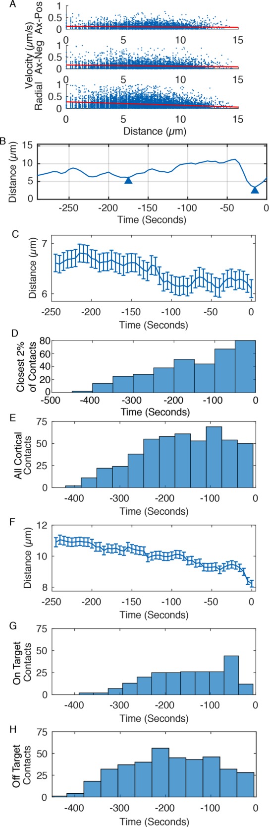 FIGURE 8:. Measurement of spindle–cortex interactions. For 100 spindles analyzed with the Spindlometer, spindle pole velocity was broken down into components parallel to (radial) or perpendicular to (axial) the nearest point on the cell boundary. (A) Linear fits to positive axial velocity, negative axial velocity, and nondirectional radial velocity against distance to cell boundary. Radial velocity is significantly greater than either axial component at the cell edge (p < 0.001). Negative axial velocity is significantly greater than positive axial velocity at the cell edge (p < 0.001). (B) Sample trace of distance between spindle pole and cell boundary. Triangles denote troughs where distance drops to <7 µm. C) Average distance of 200 spindle poles to cell boundary during metaphase. Time 0, anaphase onset. Error bars, SE. (D) For 200 metaphase spindle poles, histogram indicating the 2% of time points at which each pole was closest to the cortex, indicating a general increase in cortical contact through metaphase. (E) Timing of cortical contacts for 100 spindles during metaphase. A contact is constituted by proximity within 7 µm of the cell boundary followed by withdrawal by at least 2 µm. (F) For 200 spindle poles, average distance between the spindle pole and points on the cell cortex that fall along the anaphase axis. Time 0, anaphase onset. Error bars, SE. (G) Timing of on-target cortical contacts at the points on the cortex along the anaphase axis. Contact is constituted by proximity within 7 µm, followed by withdrawal of at least 3 µm. (H) Timing of off-target (unaligned) cortical contacts. Cortical contacts as defined in D were sorted to include only those that occurred at least 9.3 µm from the target point defined in G. |