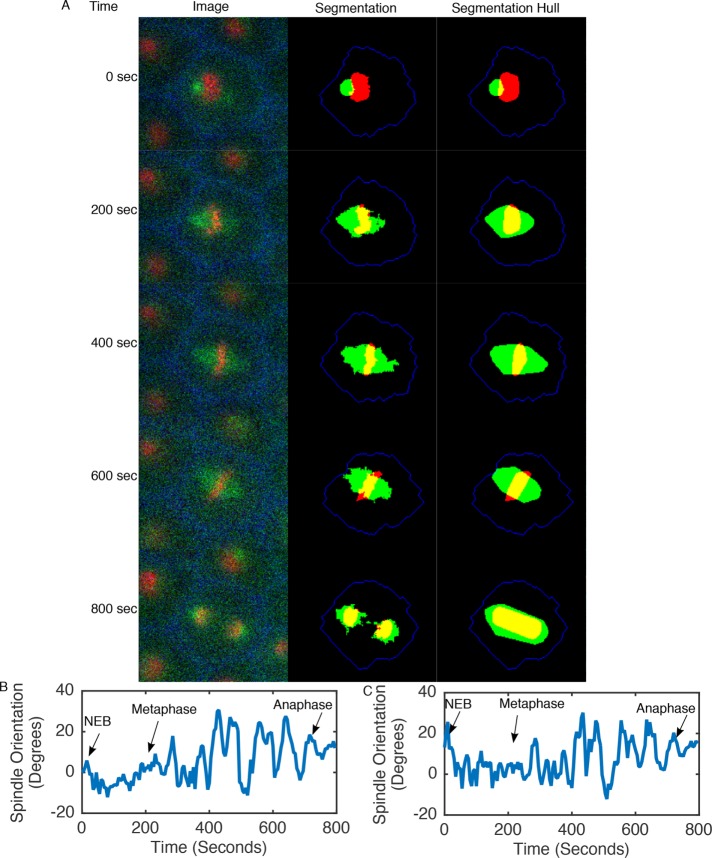 FIGURE 4:. Automated analysis detects spindle rotational oscillations. (A) A time series of mitosis in cells expressing mChe-H2B, GFP-Tub, and BFP-CAAX (left), with accompanying automatically recognized regions (middle) and the convex hull of those regions (right), output from the Spindlometer. (B) Manually and (C) automatically calculated plots of spindle rotation demonstrate rotational oscillations before anaphase onset. |