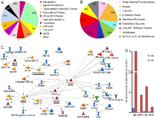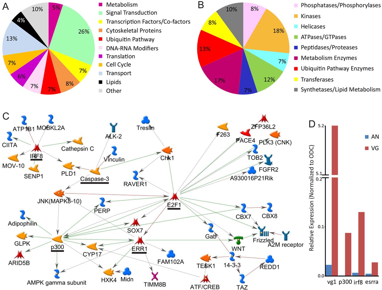 Biological process and network analysis of vegetally enriched transcripts. (A) The 198 annotated transcripts upregulated in the vegetal pole categorized according to their biological function (GeneCards). (B) Sixty vegetally enriched transcripts with enzymatic activity grouped based on enzymatic function. (C) GeneGo pathway analysis using the direct interaction algorithm of vegetally enriched transcripts. (D) RT-qPCR verification of pathway hubs p300, irf8 and err1/esrra at animal (An) versus vegetal (Vg) poles. vg1, control for vegetal pole. |