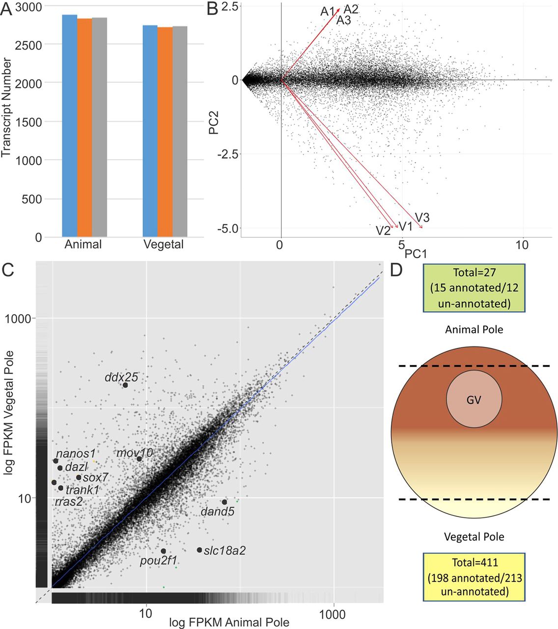 RNA-seq analysis of vegetal versus animal pole transcripts in stage VI X. laevis oocytes. (A) Total read counts for oocyte-paired vegetal and animal pole samples. Bars of the same color represent vegetal (n=3) and animal (n=3) pole samples extracted from the same oocytes. (B) Two-dimensional principal component analysis of vegetal and animal pole transcripts. Vectors V1, V2, V3 and A1, A2, A3 represent vegetal and animal pole samples, respectively. (C) Scatter plot comparing vegetal and animal pole transcripts. (D) Differential expression analysis of vegetal versus animal pole transcripts with FDR≤0.05 and FPKM≥5. GV, germinal vesicle. |