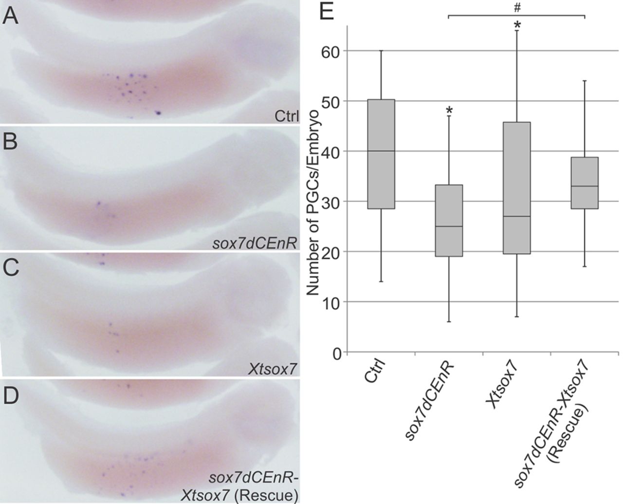 pg), alone and in combination. Tailbud embryos were analyzed for xpat expression by WISH. Representative images are shown (A-D). The number of PGCs per embryo was quantified (E). Uninjected control (ctrl), n=28; sox7dCEnR, n=24; Xtsox7, n=27; sox7dCEnR and Xtsox7, n=28. *P<0.05 compared with uninjected control. #P<0.05 compared with sox7dCEnR. Analysis based on at least two independent experiments. |