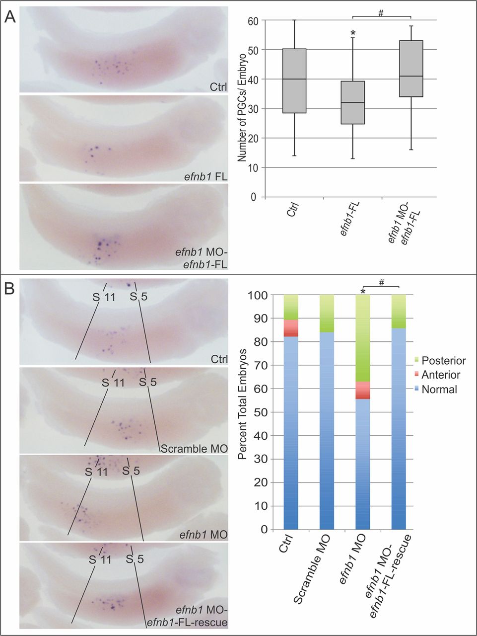 efnb1 is required for normal PGC number and migration. One-cell embryos were injected in the vegetal region with (A) efnb1-FL alone (200â