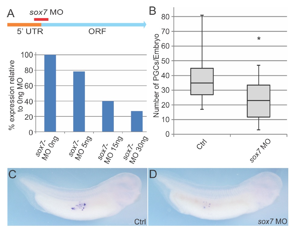 Altering sox7 expression reduces PGC number. One-cell embryos were injected in the vegetal region with sox7dCEnR RNA (200â